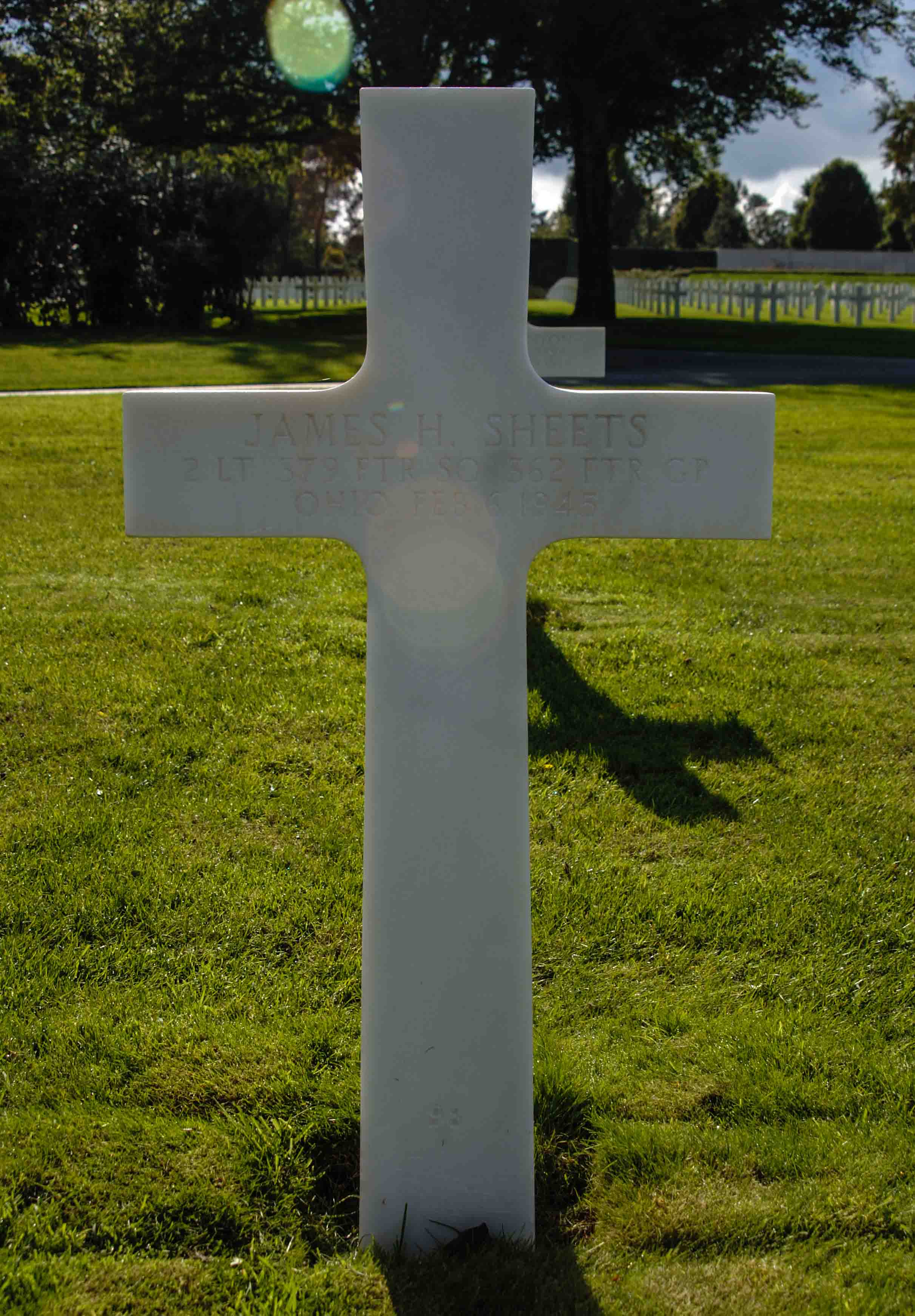James H. Sheets was born on March 17, 1923 in Middletown, Butler County, Ohio. He was the son of Hobert Liewellyn Sheets and husbund of Mary Jane McCullough Sheets. He served in the 379th Fighter Squadron, 362nd Fighter Group as a Second Lieutenant during World War II. During the attach on Dansburg, Germany, 2LT Sheets' P-47 was hit by flak and he was killed in the subsequent crash 10 miles short of base. He is now buried in the Lorraine American Cemetery, Saint-Avold, France.
