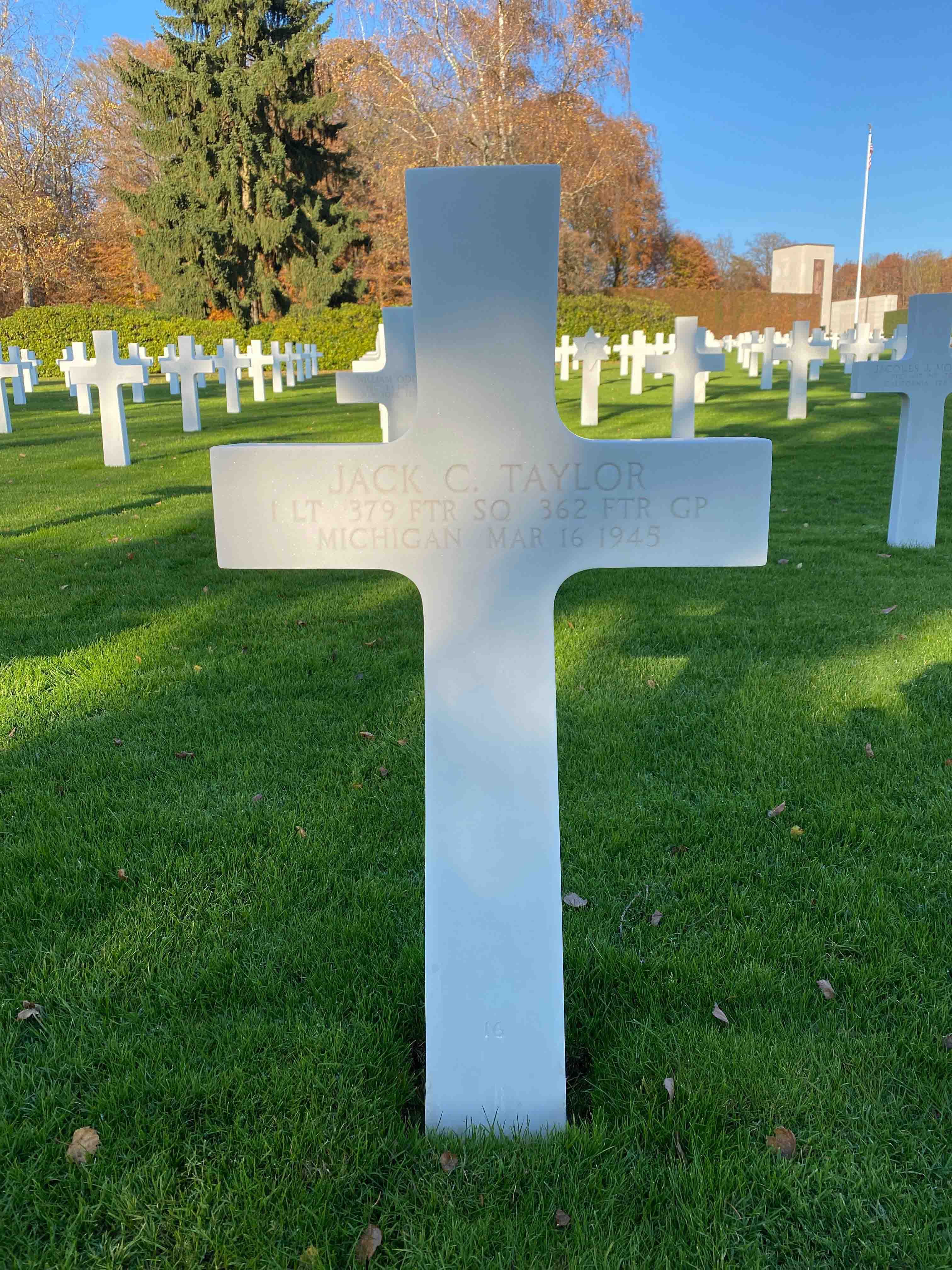 Jack Clark Taylor was born on December 23, 1920. He served in the 379th Fighter Squadron, 362nd Fighter Group as a First Lieutenant during World War II. On March 16, 1945, the group flew 44 four-plane missions around Koblenz, Germany on what may have been its busiest day of the war, claiming 227 trucks, 33 horse-drawn wagons, five tanks, 29 rail cars, and two half-tracks. The area was left "a ghostly sight," according to Col. Joe Laughlin, "abandoned and wrecked equipment everywhere, woods jammed with junk but almost no sign of life or resistance." One 379th flight destroyed a pair of flak guns in the Bad Kreuznach area, but as "Lt. [Jack] Taylor and his wingman went down to strafe some vehicles coming out of a small town just south of Bingen, Lieutenant Taylor called in that he had been hit in the engine," reported Lt. Thomas Peyton. "He immediately headed northwest, trailing smoke and oil. After about three minutes he called that his oil pressure was zero and that he was going to belly in. He headed for an open field, but failed to clear the edge of a forest and crashed into the trees. The plane burned immediately upon hitting." Taylor was killed in the crash. 1LT Taylor is now buried in the Luxembourg American Cemetery, Luxembourg. He also has a cenotaph located in Indianfields Township Cemetery, Caro, Tuscola County, Michigan.