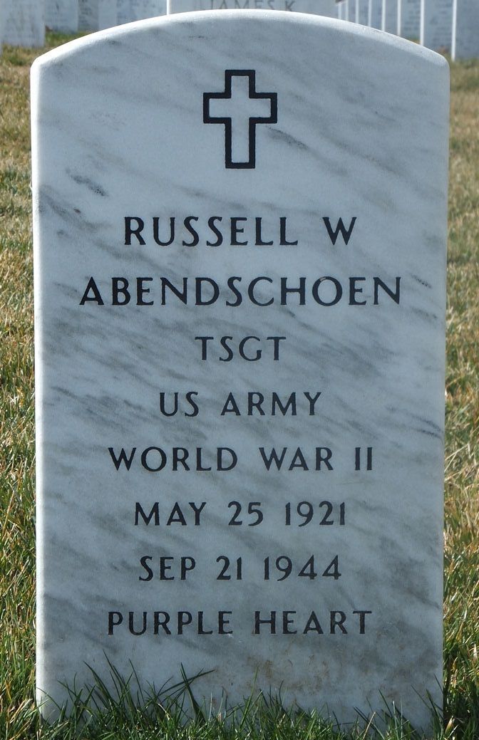 In 1945 and 1946, Dutch citizens recovered some of the remains of the soldiers and buried them in a nearby cemetery. A few years later, U.S. military officials moved them to Zachary Taylor National Cemetery in Kentucky. Buried under a single stone are the remains of Abendschoen as well as his four crewmates: 1st Lt. Cecil W. Biggs of Teague, Texas; 1st Lt. William L. Pearce of San Antonio, Texas; 2nd Lt. Thomas R. Yenner of Kingston, Pa., and Staff Sgt. George G. Herbst of Brooklyn, N.Y. TSgt Abendschoen's final resting place is now in the Arlington National Cemetery, Arlington, Arlington County, Virginia, USA.
