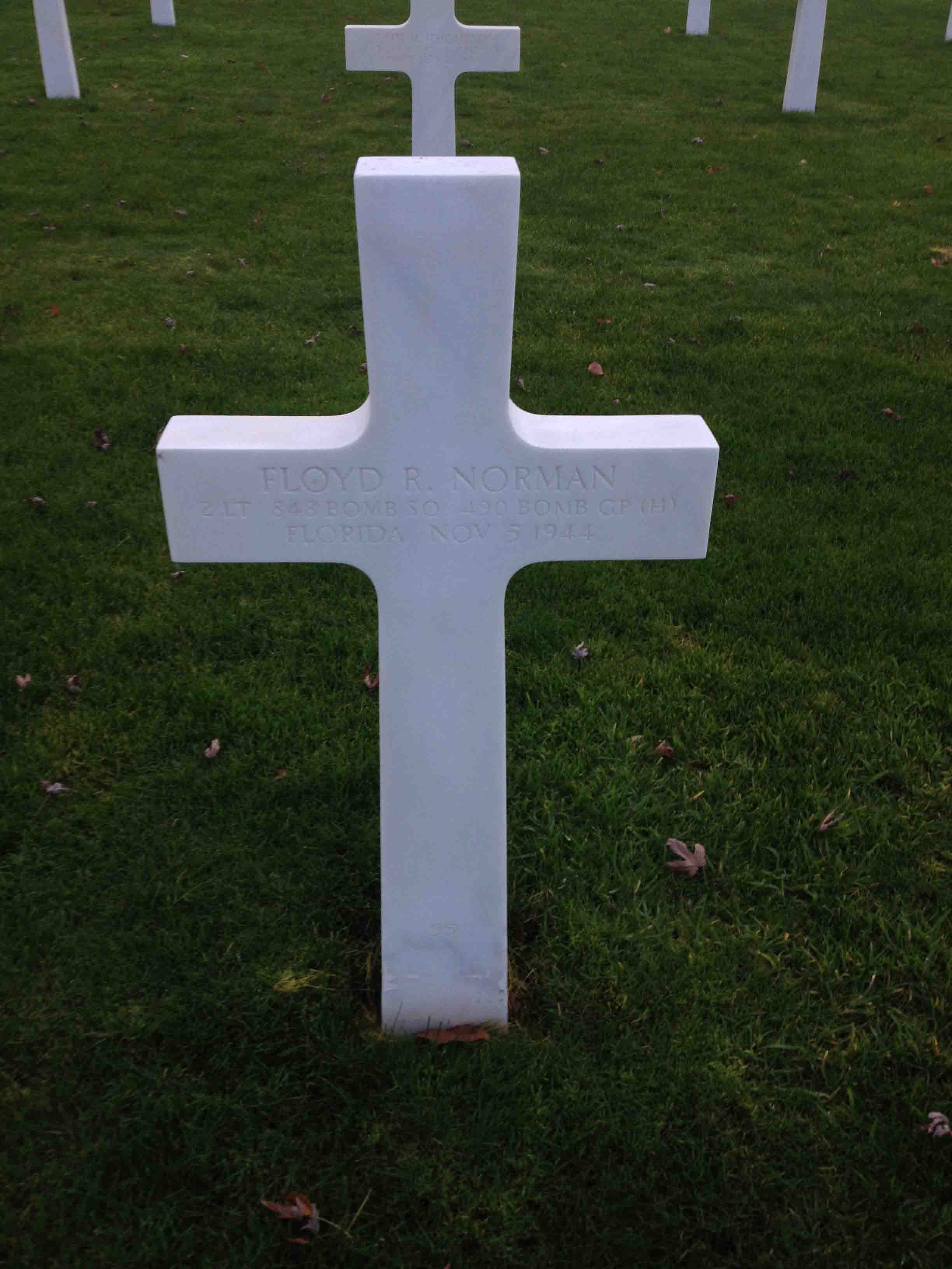 Floyd R. Norman was born on June 18, 1923, in Omaha, Nebraska. He served in the 848th Bomber Squadron, 490th Bomber Group, Heavy, as a Second Lieutenant and Co-Pilot on the B-17G #43-37884 "Pensy Belle" during World War II. He was Killed in Action on November 5, 1944, when his plane crashed near Neustadt, Germany. They were on a bombing run hitting the Focke Wulf plant in Bremen. 2Lt Norman is now buried in the Lorraine American Cemetery, Saint-Avold, France.