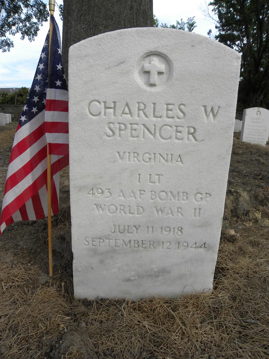Charles W. Spencer was born on July 11, 1918. He served in the 863rd Bomber Squadron, 493rd Bomber Group, Heavy, as a First Lieutenant and Pilot on the B-17 43-38295 during World War II. He was Killed in Action on September 12, 1944, when his airplane was shot down by an enemy aircraft and crashed at Aderstedt, north of Halberstadt, Germany. As a result of the crash, 4 of the crew members were killed while five members were taken as prisoners