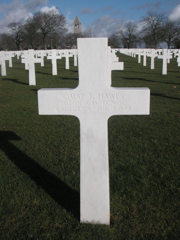He served in the 17th Cavalry Reconnaissance Squadron, as a Sergeant during World War II. Hawes was the crew commander of an armored car M-8, of the third platoon, Troop C, 17th Cavalry Reconnaissance Squadron, 15th Cavalry Group. His platoon was ambushed at the east entrance of Dol-de-Bretagne, in a hamlet called Les Rolandières. His armored car was destroyed by a German antitank gun, killing the four members of the crew. He was Killed in Action on August 3, 1944, during the liberation of Dol-de-Bretagne. He was awarded the Purple Heart and was buried at Brittany American Cemetery and Memorial, Saint-James, Departement de la Manche, Basse-Normandie, France.