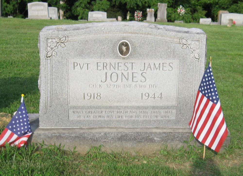 He served in Company K, 329th Infantry Regiment, 83rd Infantry Division, as a Private during World War II. Pvt. Jones was Killed in Action on August 11, 1944, during the Liberation of Saint-Malo in France. He was buried at White Oak Cemetery, Clay, Webster County, Kentucky, USA, and was awarded the Purple Heart.