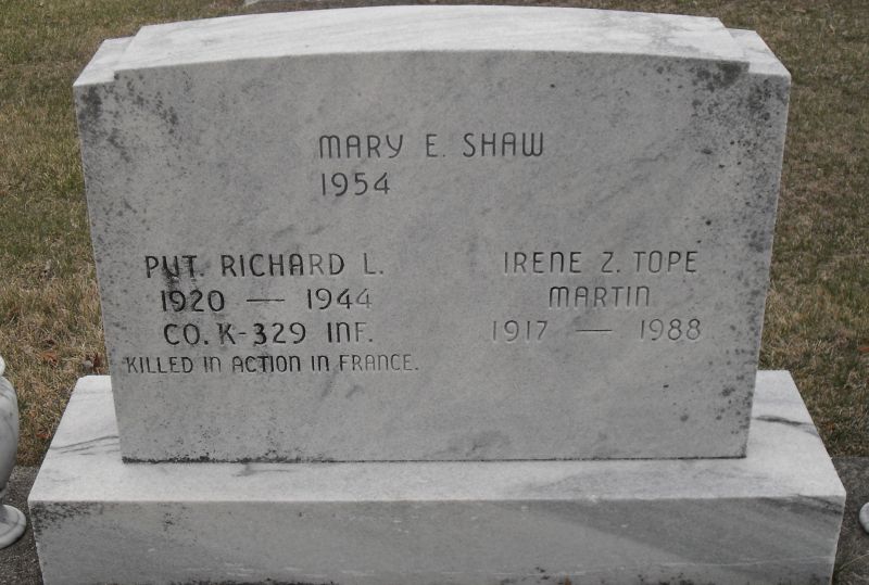 Richard Tope entered service on December 10, 1943. He served in Company K, 329th Infantry Regiment, 83rd Infantry Division, as a Private during World War II. He was Killed in Action on August 12, 1944, during the Liberation of Saint-Malo in France. Pvt. Tope was buried at Decatur Cemetery, Decatur, Adams County, Indiana, USA, and was awarded the Purple Heart.