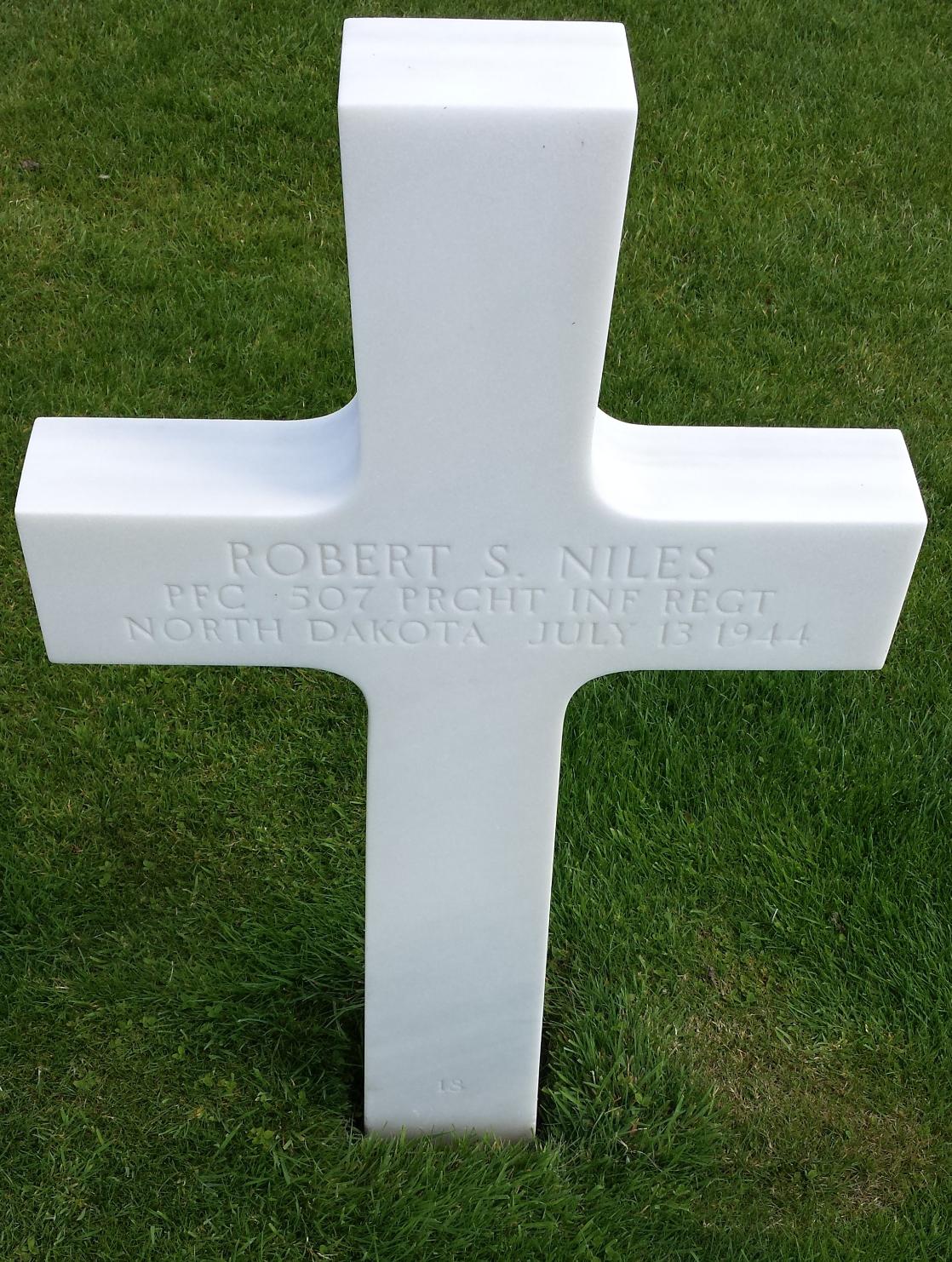 Robert S. Niles was born on March 22, 1914, in Kidder County, North Dakota. He served in the 507th Infantry Regiment, 82nd Airborne Division. as a Private First Class during World War II. PFC Niles was Killed in Action on July 13, 1944, during the Battle of Graignes in France. He is now buried in Normandy American Cemetery and was awarded the Purple Heart.