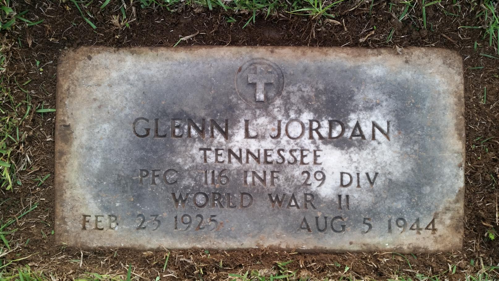 Glenn served in the 116th Infantry Regiment, 29th Infantry Division, as a Private First Class during World War II. He was Killed in Action on August 5, 1944, during the liberation of Vire, France. PFC Jordan is now buried in the Mount Juliet Memorial Gardens, Mount Juliet, Wilson County, Tennessee, USA.