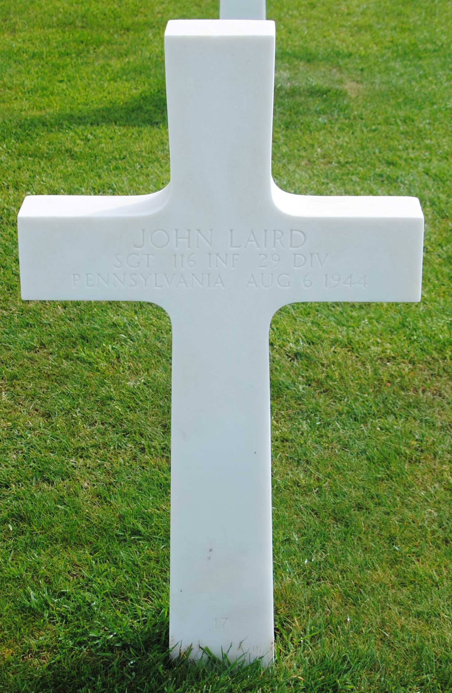 John Laird was born on September 20, 1910, in Layland, Fayette County, West Virginia. He served in the 116th Infantry Regiment, 29th Infantry Division, as a Sergeant during World War II. He was Killed in Action on August 6, 1944, during the liberation of Vire, France. Sgt Laird is now buried in the Brittany American Cemetery and Memorial, Saint-James, Departement de la Manche, Basse-Normandie, France.