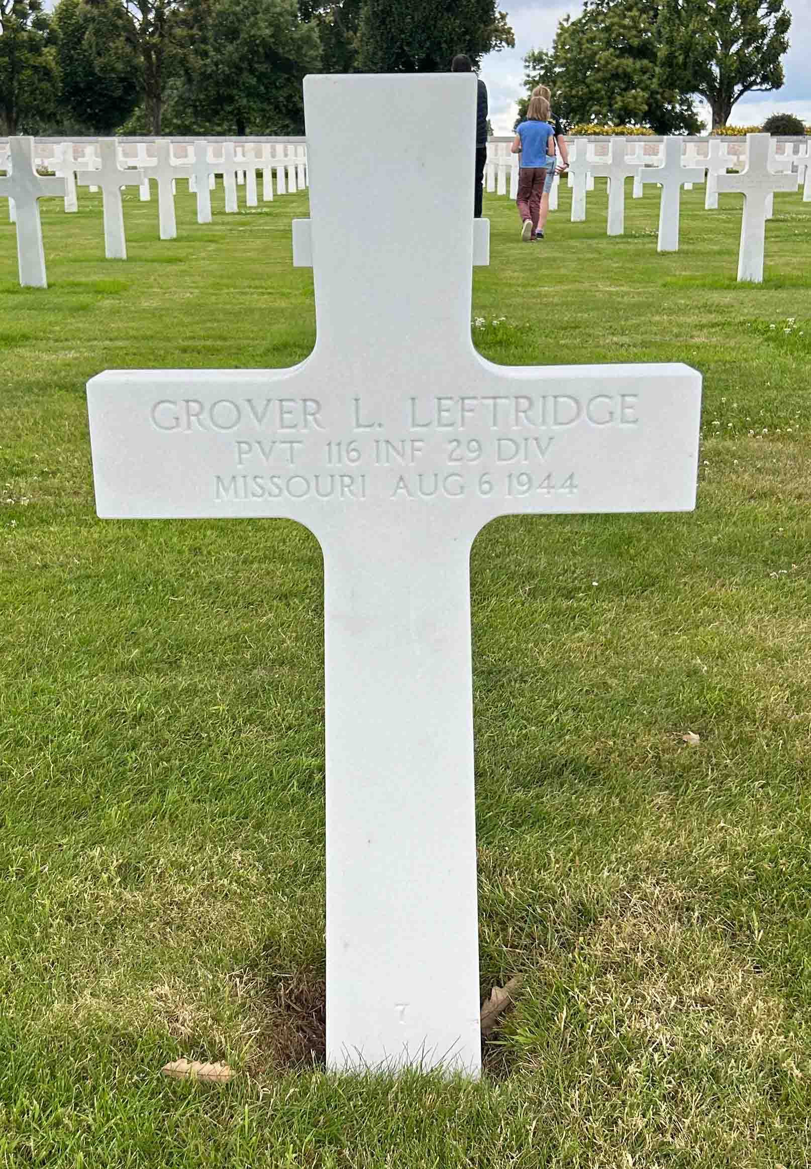 Grover served in the 116th Infantry Regiment, 29th Infantry Division, as a Private during World War II. He was Killed in Action on July 19, 1944, during the liberation of Vire, France. Pvt Leftridge is now buried in the Brittany American Cemetery and Memorial, Saint-James, Departement de la Manche, Basse-Normandie, France.