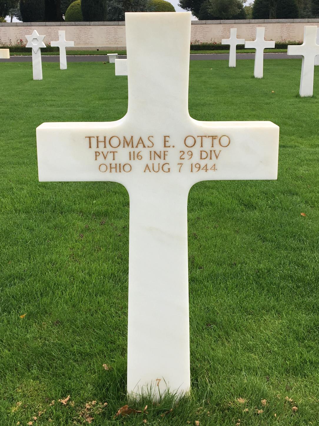 Thomas served in the 116th Infantry Regiment, 29th Infantry Division, as a Private during World War II. He was Killed in Action on August 7, 1944, during the liberation of Vire, France. Pvt Otto is now buried in the Brittany American Cemetery and Memorial, Saint-James, Departement de la Manche, Basse-Normandie, France.