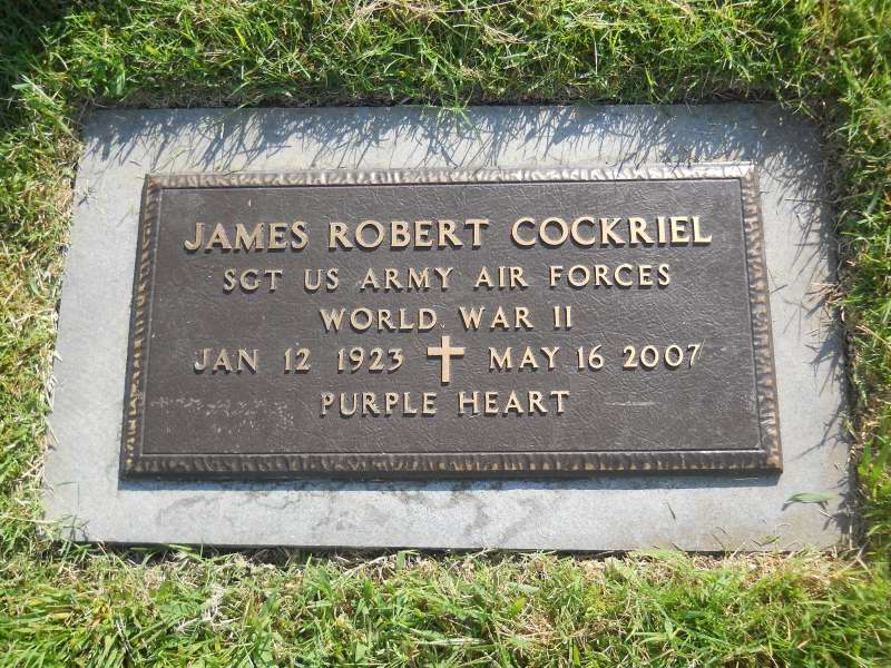James Robert Cockriel was born on January 12, 1923, in Platte City, Platte County, Missouri. He was the son of Robert Earle Cockriel and Leota Naylor Cockriel. He was married to Imogene "Jean" Wilson Cockriel. He served in the 700th Bomber Squadron, 445th Bomber Group, Heavy, as a Sergeant and Tail Gunner of the B-24 #4129306 'K for King' during World War II.
