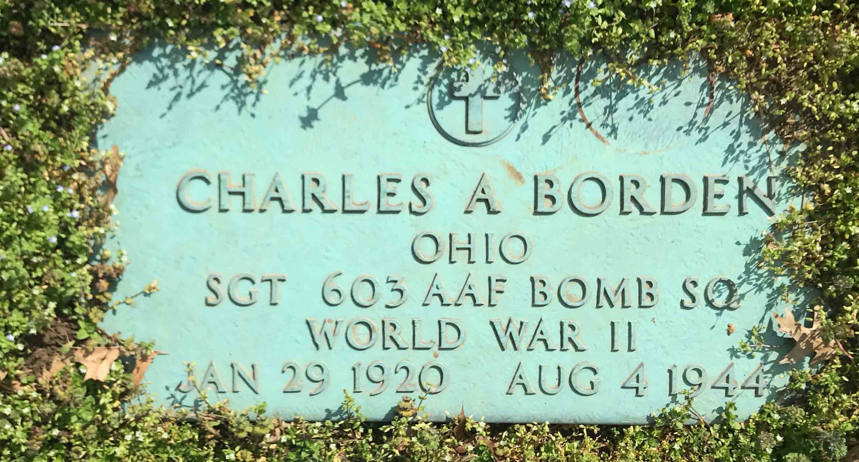 Charles Andrew Borden was born on January 29, 1920, in Gallipolis, Gallia County, Ohio. He was the son of Charles S. Borden and Emma L. Mudders Borden. He served in the 603rd Bomber Squadron, 398th Bomb Group, Heavy, as a Sergeant and Tail Gunner of B-17 #42-107186 during World War II.