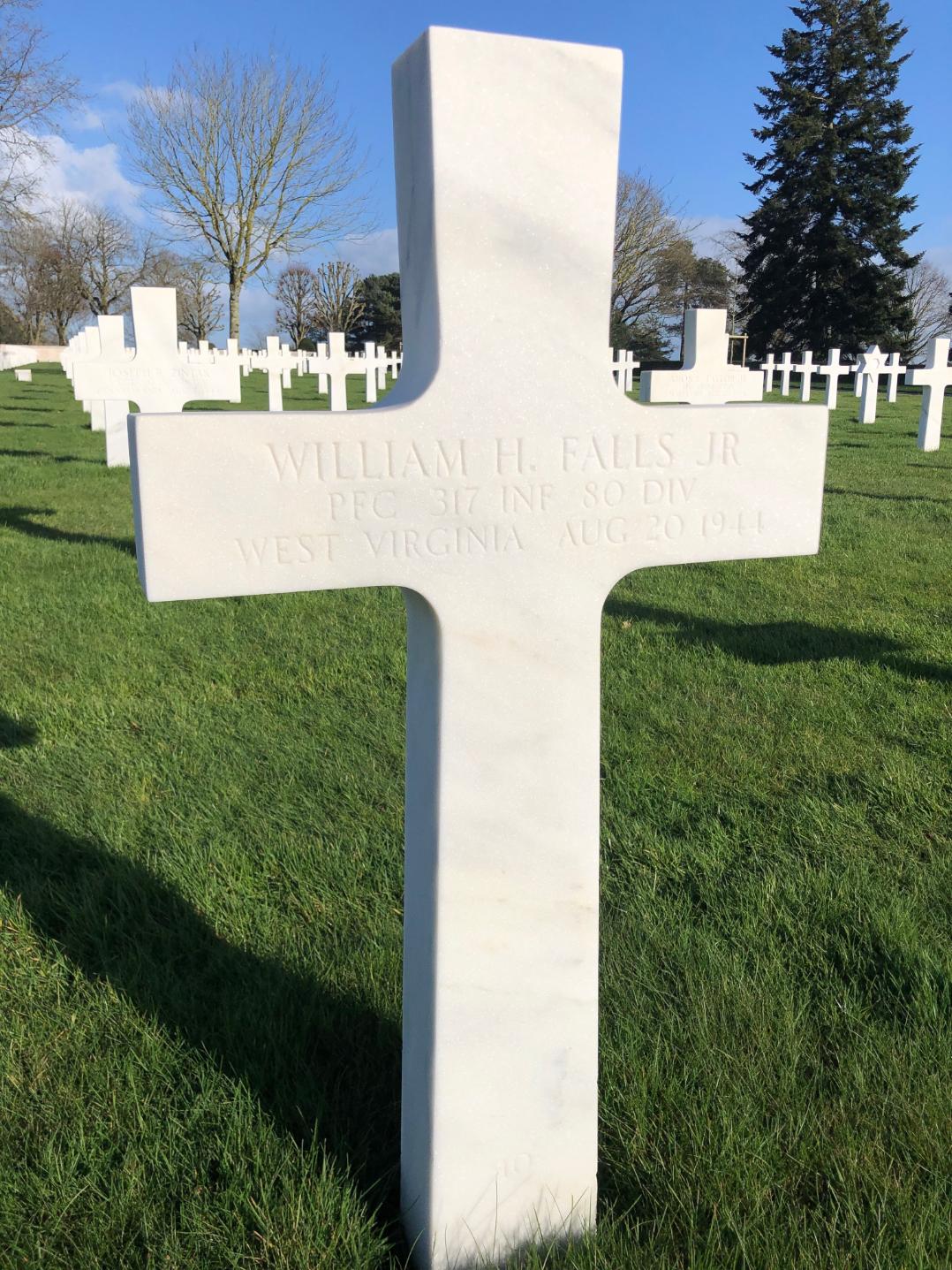 PFC Falls was Killed in Action on August 20, 1944, during the liberation of Argentan, France. He is now buried in the Brittany American Cemetery and Memorial, Saint-James, Departement de la Manche, Basse-Normandie, France. He also has a cenotaph in the Maple Hill Cemetery, Huntsville, Madison County, Alabama, USA.