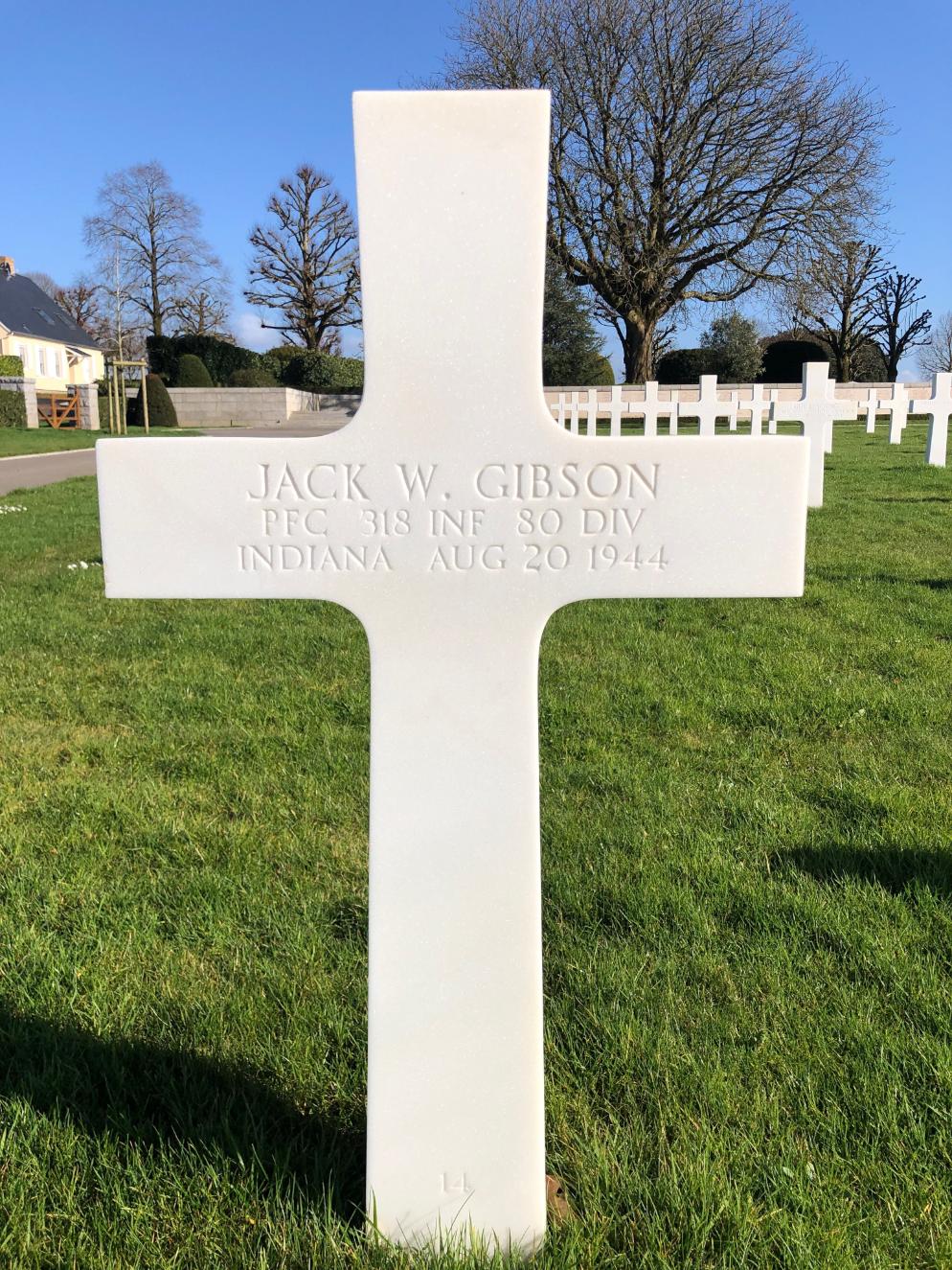 PFC Gibson was Killed in Action on August 20, 1944, during the liberation of Argentan, France. He is now buried in the Brittany American Cemetery and Memorial, Saint-James, Departement de la Manche, Basse-Normandie, France.