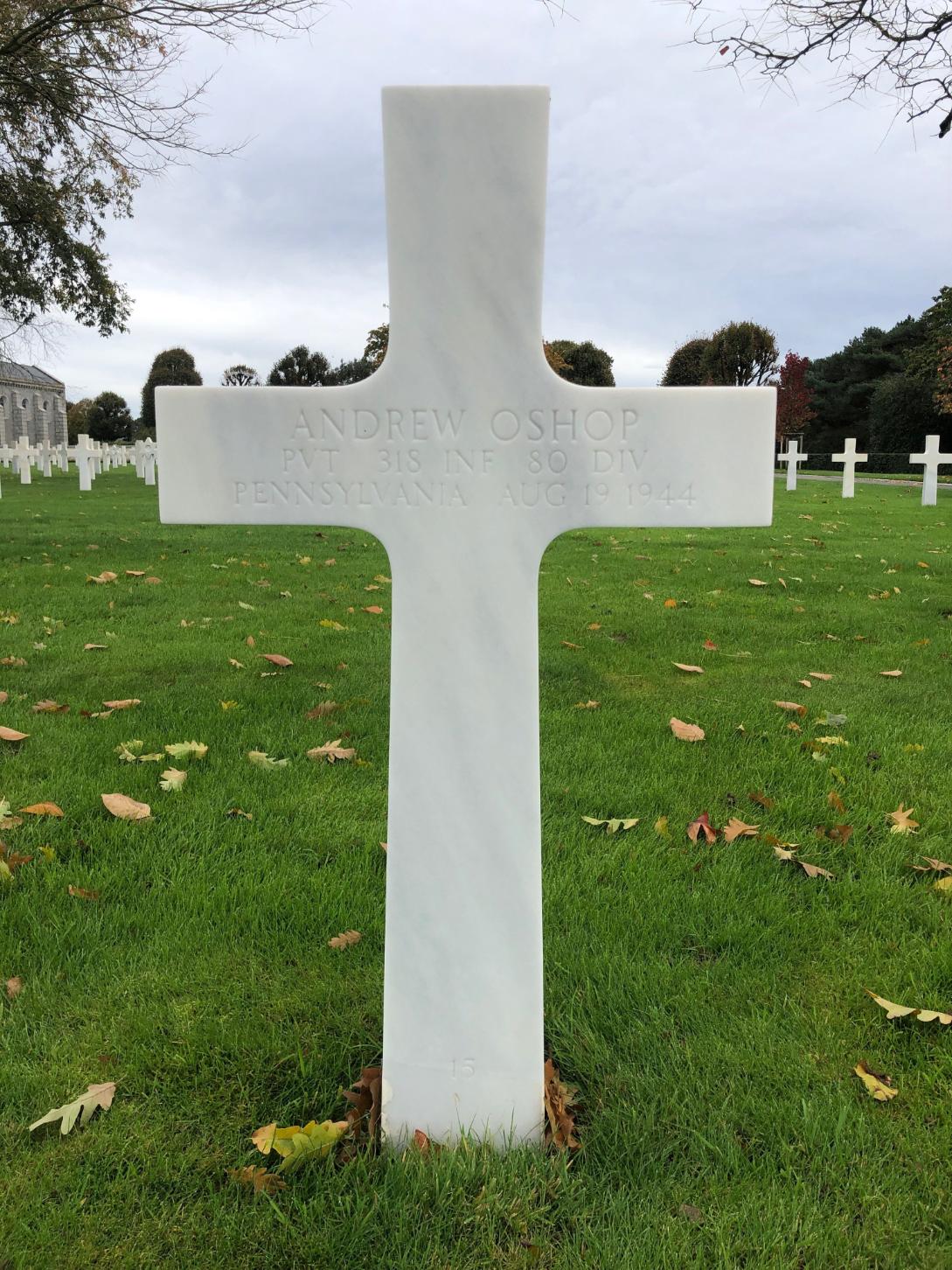Pvt Oshop was Killed in Action on August 19, 1944, during the liberation of Argentan, France. He is now buried in the Brittany American Cemetery and Memorial, Saint-James, Departement de la Manche, Basse-Normandie, France.