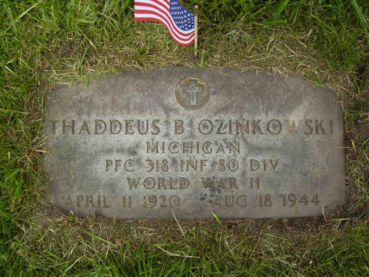 PFC Ozinkowski was Killed in Action on August 18, 1944, during the liberation of Argentan, France. He is now buried in the Mount Olivet Cemetery, Detroit, Wayne County, Michigan, USA.