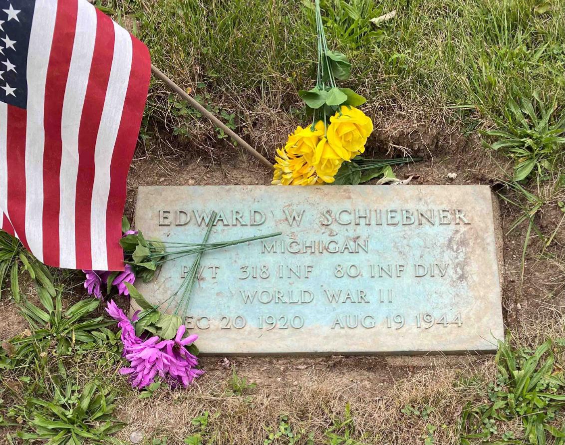 Pvt Schiebner died from his wounds received in battle on August 18, 1944, during the liberation of Argentan, France. He is now buried in the Hillcrest Memorial Gardens, Owosso, Shiawassee County, Michigan, USA.