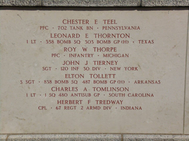 PFC Teel was reported Missing in Action and officially declared dead on August 18, 1944, during the liberation of Argentan, France. His name is memorialized in the Tablets of the Missing in the Brittany American Cemetery and Memorial, Saint-James, Departement de la Manche, Basse-Normandie, France.