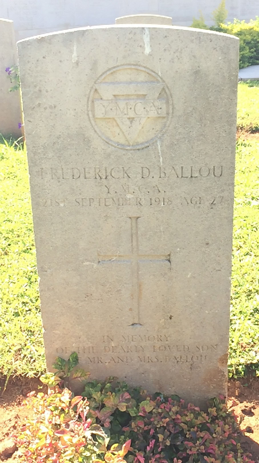 Frederick D. Ballou was born in Richmond, Kentucky on 27 February 1891 to Mrs. Pattie Ballou. He worked as a printer. He served in the American Young Men's Christian Association (YMCA) during WWI. He shipped out to the East African Campaign in what was then known as German East Africa on 10 February 1917. He served as the Secretary for the East African Expeditionary Forces. He drowned in the harbor of Dar es Salem on 21 September 1918, and is now buried in the Upanga Road Cemetery, Dar-es-Salaam, Dar es Salaam, Tanzania. Source of information: Summary of World War Work of the American Y.M.C.A., The International Committee of Young Men's Christian Associations, 1920.