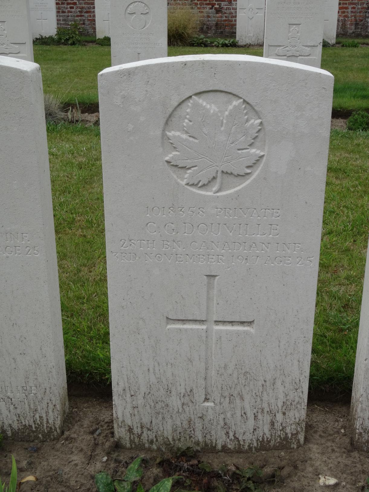 Pvt Douville died from his wounds received in battle on November 3, 1917, in Belgium. He is now buried in the Potijze Chateau Grounds Cemetery, Ypres, Arrondissement Ieper, West Flanders, Belgium.Source of information: www.cwgc.org