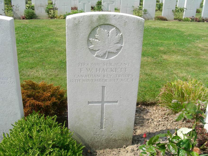 Sgt Hackett died from his wounds received in battle on November 12, 1917. He is now buried in the Dozinghem Military Cemetery, Westvleteren, Arrondissement Ieper, West Flanders, Belgium.