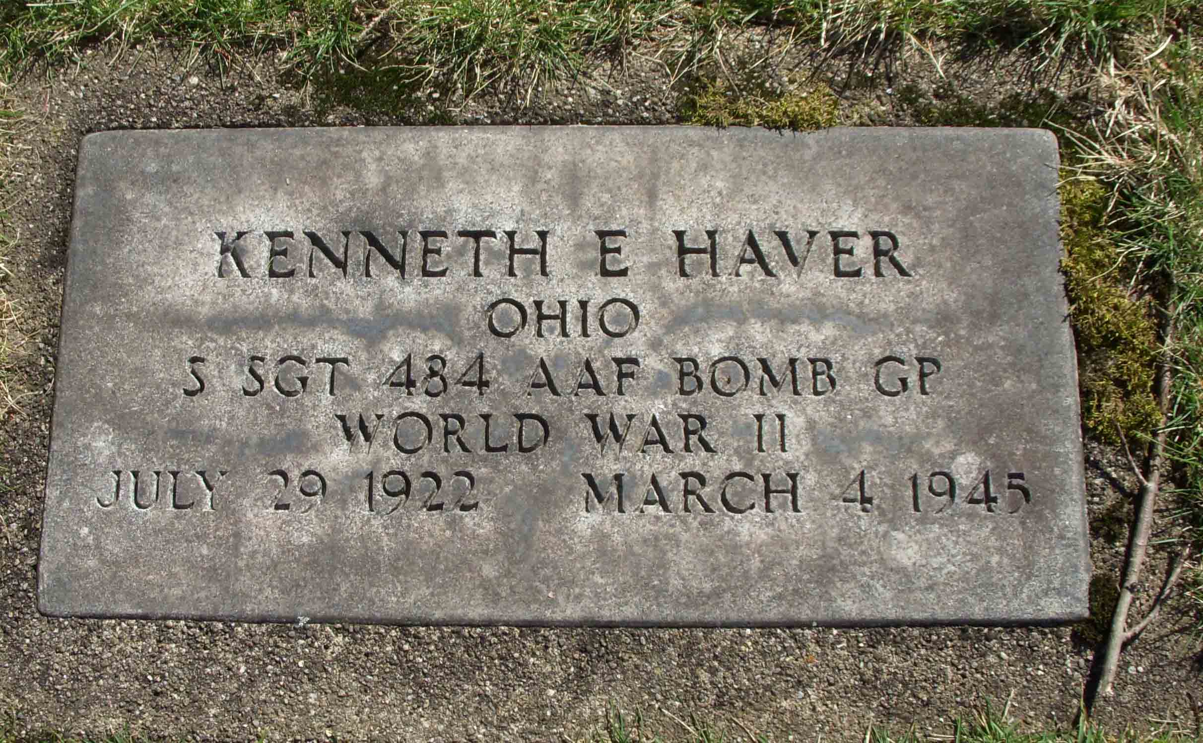 Kenneth Eugene Haver was born on July 29, 1922, in Ohio. He was the son of Harry Van Buren Haver Sr. and Phyllis John Haver. He served in the 826th Bomber Squadron, 484th Bomber Group, Heavy, as a Staff Sergeant and Tail Gunner of B-24J #42-51967 nicknamed ''Strange Cargo'' during World War II.