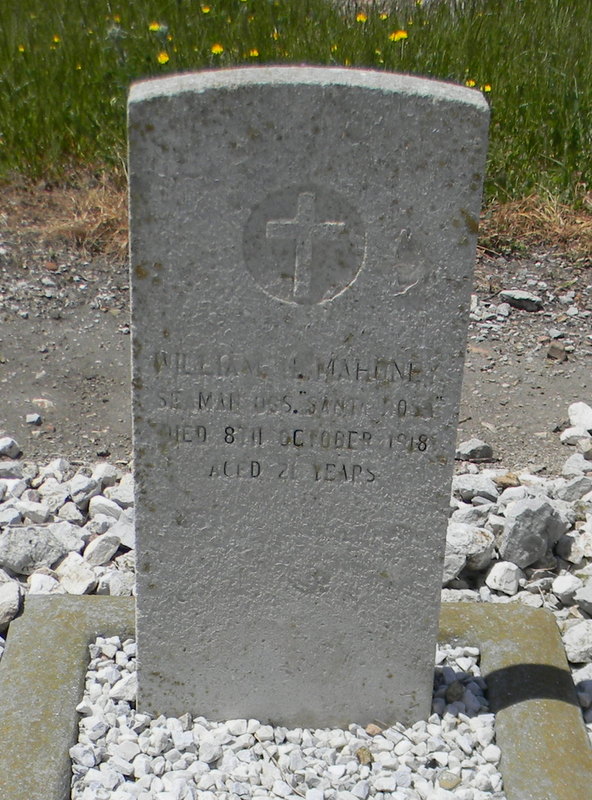 William H. Mahoney, born in 1897, served as a Seaman with the U.S. Merchant Marine aboard the U.S.A.T. Santa Rosa during World War I. He died on October 8, 1918, at the age of 21, and was laid to rest in North Front Cemetery, Gibraltar. His headstone bears the inscription “U.S.S. Santa Rosa,” referring to a commissioned Navy vessel, though his actual service was aboard the Army transport ship Santa Rosa.