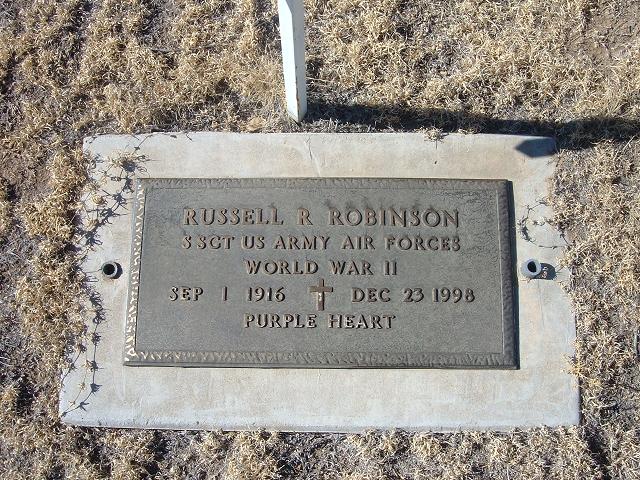 Russell Ray Robinson was born on September 1, 1916. He was the son of Ray Julius Robinson and Carrie Margaret Lute Robinson. He was married to Elsie Mae McCormack Robinson. He served in the 510th Bomber Squadron, 351st Bomb Group, Heavy, as a Sergeant and Ball Turret Gunner of B-17 #42-31763 nicknamed ''Ten Horsepower'' during World War II.