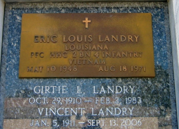 Eric Louis Landry was born on May 10, 1948. He was the son of Vincent Landry and Girtie L. Brignac Landry. He served in the Heavy Mortar Platoon, Headquarters and Headquarters Company, 2nd Battalion, 4th Infantry Regiment, as a Private First Class and Mortarman during the Vietnam War era.