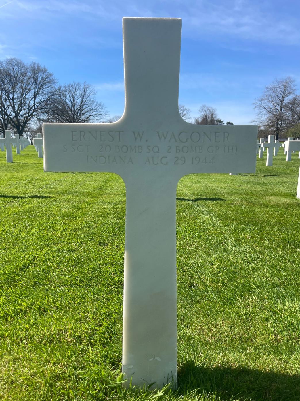 SSgt Wagoner was one of the 28 U.S. airmen laid to rest in a mass grave at Slavicin, Czechoslovakia, before being exhumed and reinterred at Lorraine American Cemetery and Memorial, Saint-Avold, Departement de la Moselle, Lorraine, France. He also has a cenotaph in the Mt. Zion Cemetery, Fulton County, Indiana, USA.
