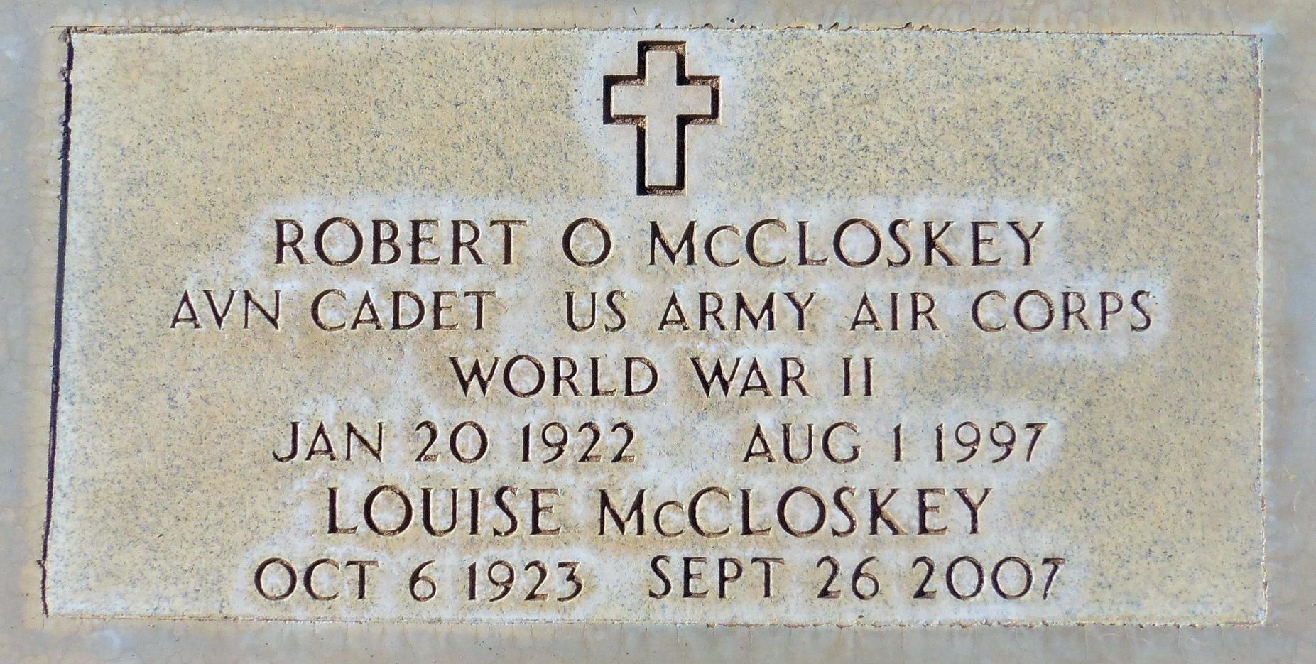 Robert O. McCloskey was born on January 20, 1922. He was the son of Thomas W. McCloskey and Clara A. Jones McCloskey. He was the husband of Louise Manderscheid McCloskey. He served in the 20th Bombardment Squadron, 2nd Bomber Group, Heavy, as a Second Lieutenant and Pilot of B-17 #42-31473 nicknamed 'My Baby' during World War II.