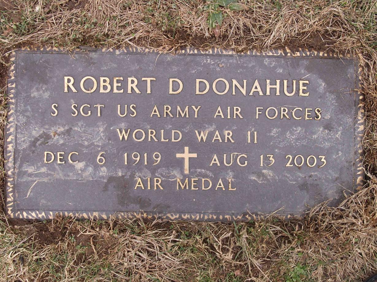 SSgt Donahue managed to evade capture; he made his way into Slovakia, where he was rescued on September 17, 1944, by a B-17 conducting a secret OSS mission from an airfield held by Slovak partisans. He died on August 13, 2003, and is now buried in the Christ Our Redeemer Catholic Cemetery, Pittsburgh, Allegheny County, Pennsylvania, USA.