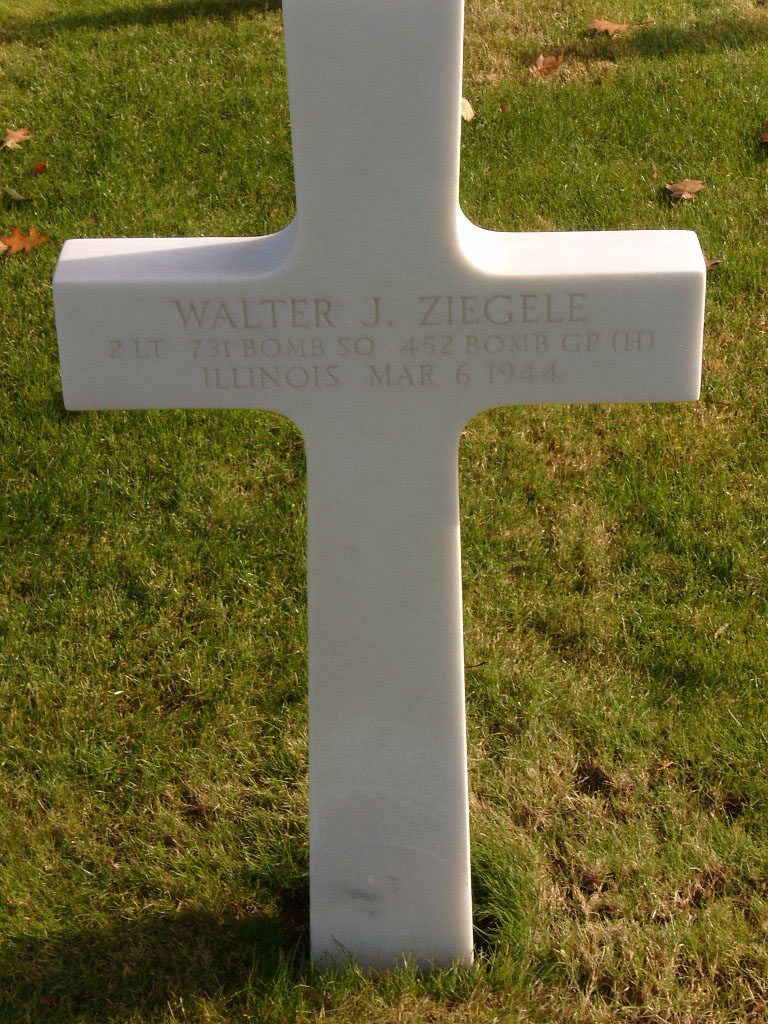 On March 6, 1944, the B-17G “Evanton Babe” (42-31919) of the 731st Bombardment Squadron, 452nd Bombardment Group, Eighth Air Force, on return from a mission over Berlin, the aircraft was hit by flak and then attacked by fighters. When the pilot was unable to stop the intense fire in the number 4 engine, he told the crew to bail out due to imminent explosion. Although the engine fell off, the pilot managed to return to England and crashed at Metfield. Most crew members were captured on the ground near Emmen, Netherlands. 2LT Ziegele died when his chute failed. He is now buried in the Netherlands American Cemetery and Memorial, Margraten, Eijsden-Margraten Municipality, Limburg, Netherlands.