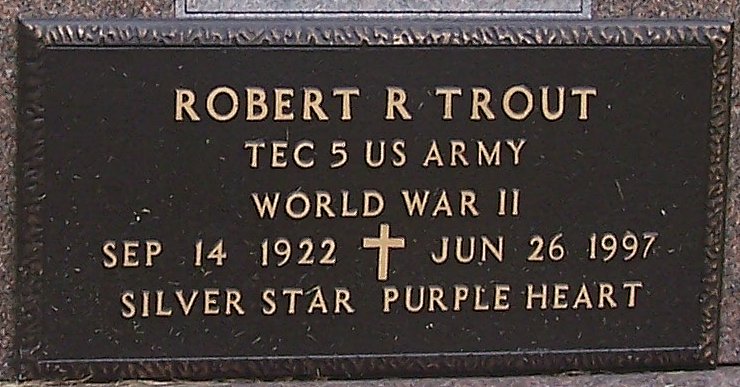 The President of the United States of America, authorized by Act of Congress July 9, 1918, takes pleasure in presenting the Silver Star to Private First Class Robert R. Trout (ASN: 35595086), United States Army, for gallantry in action while serving with the Medical Detachment, 16th Infantry Regiment, 1st Infantry Division, in action against the enemy in Normandy, France, on 6 June 1944. His gallant actions and dedicated devotion to duty, without regard for his own life, were in keeping with the highest traditions of military service and reflect great credit upon himself and the United States Army.
