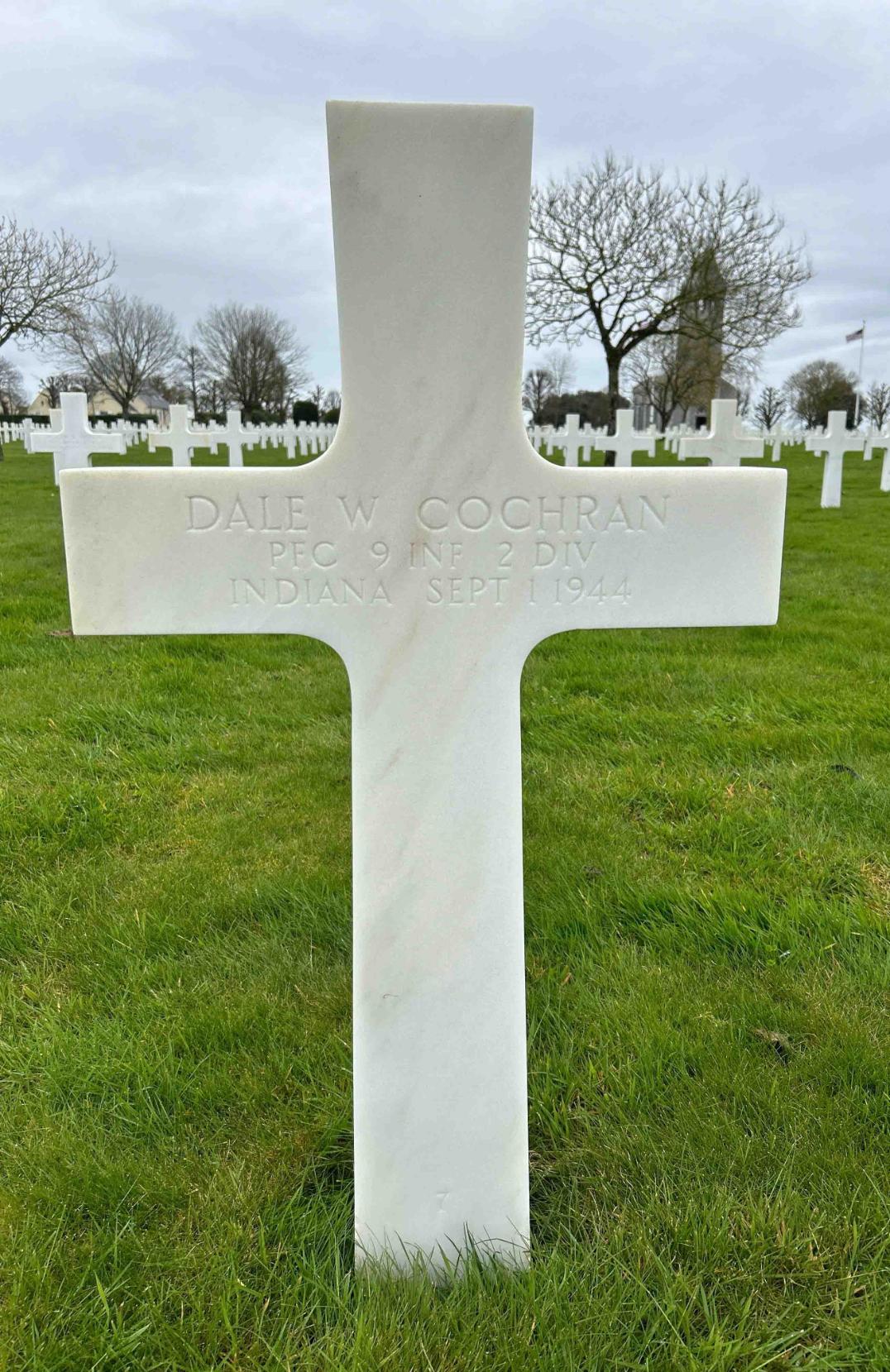 PFC Cochran was Killed in Action on September 1, 1944, during the Battle of Brest, France. He is now buried in the Brittany American Cemetery and Memorial, Saint-James, Département de la Manche, Basse-Normandie, France.