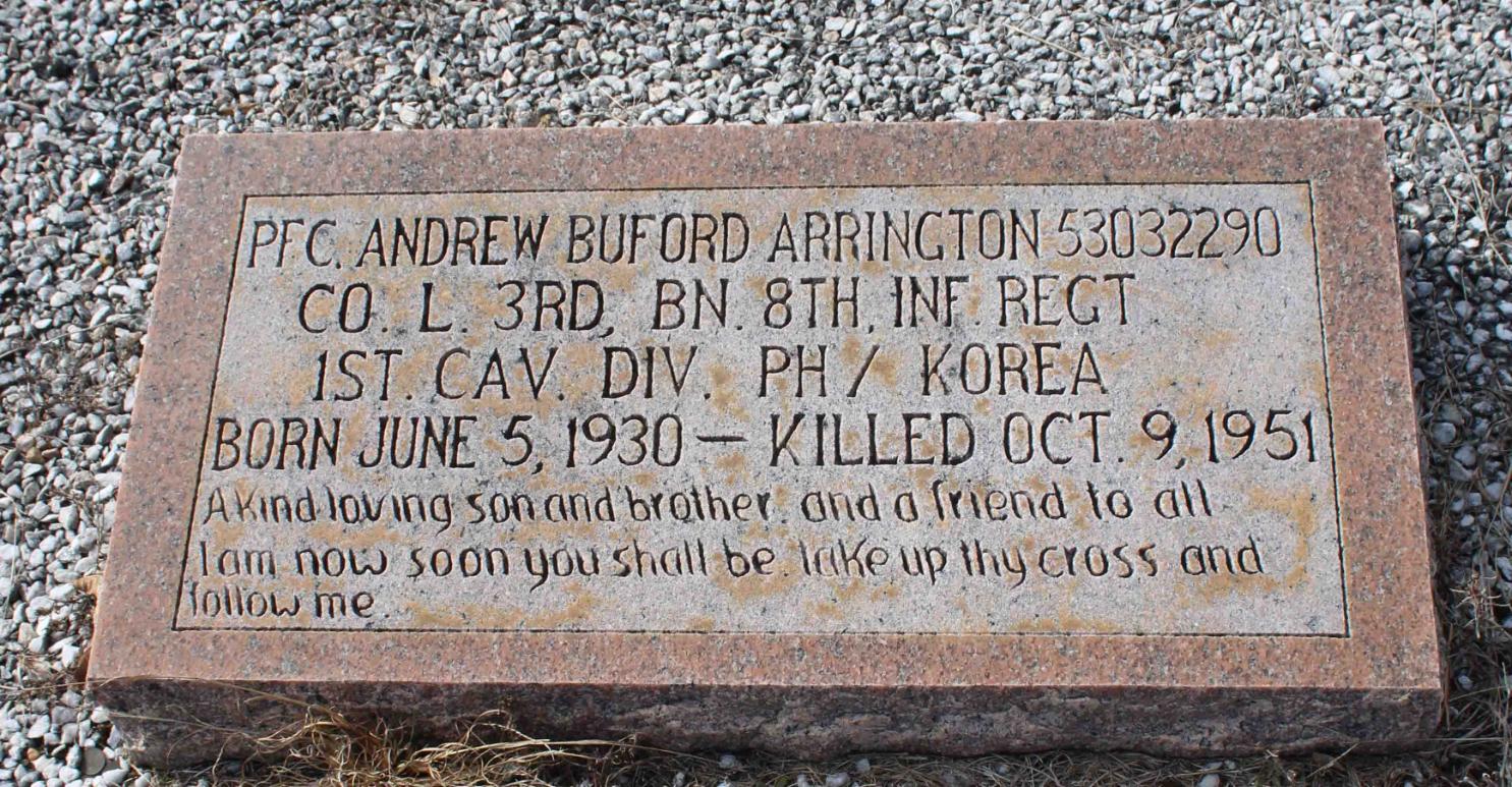 PFC Arrington was Killed in Action on October 9, 1951, in North Korea. He is now buried in the Sandfield Cemetery, Troy, Pike County, Alabama, USA.