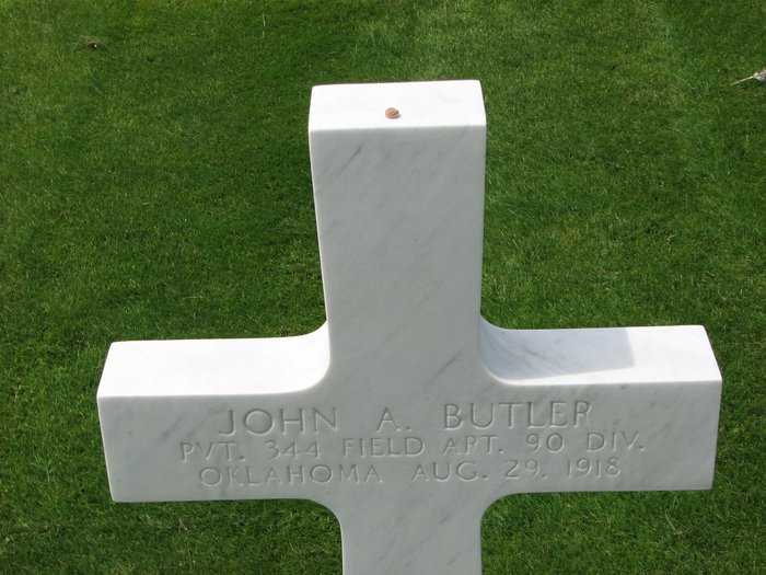 John A. Butler served in the 344th Field Artillery Regiment, 90th Division as a Private during World War I. He died of disease on August 29, 1918, in the hospital La Courneau, Camp Hunt in France He was buried at Suresnes American Cemetery and Memorial, Suresnes, Departement des Hauts-de-Seine, Īle-de-France, France.