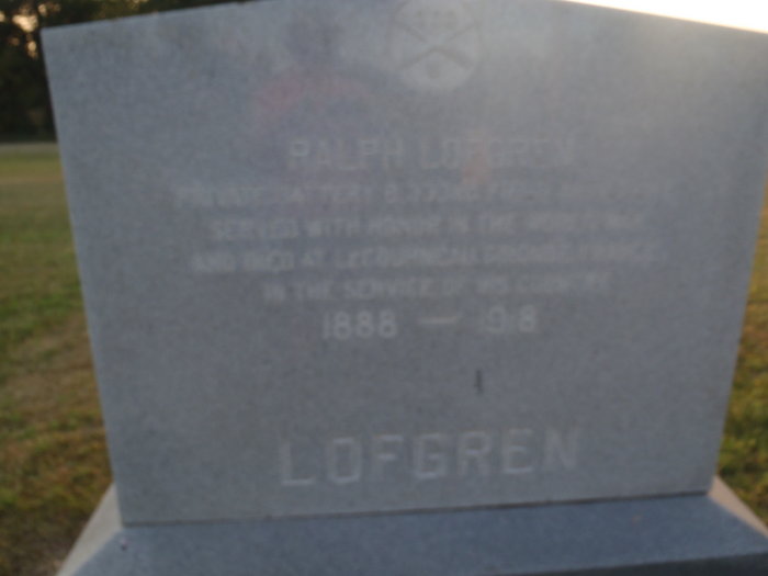 Ralph Lofgren was born on June 26, 1888. He served in the US Army as a Private during World War I. He died of disease on November 15, 1918, in the hospital La Courneau, Camp Hunt in France. He was buried at Trinity Cemetery, Henning, Otter Tail County, Minnesota, USA.