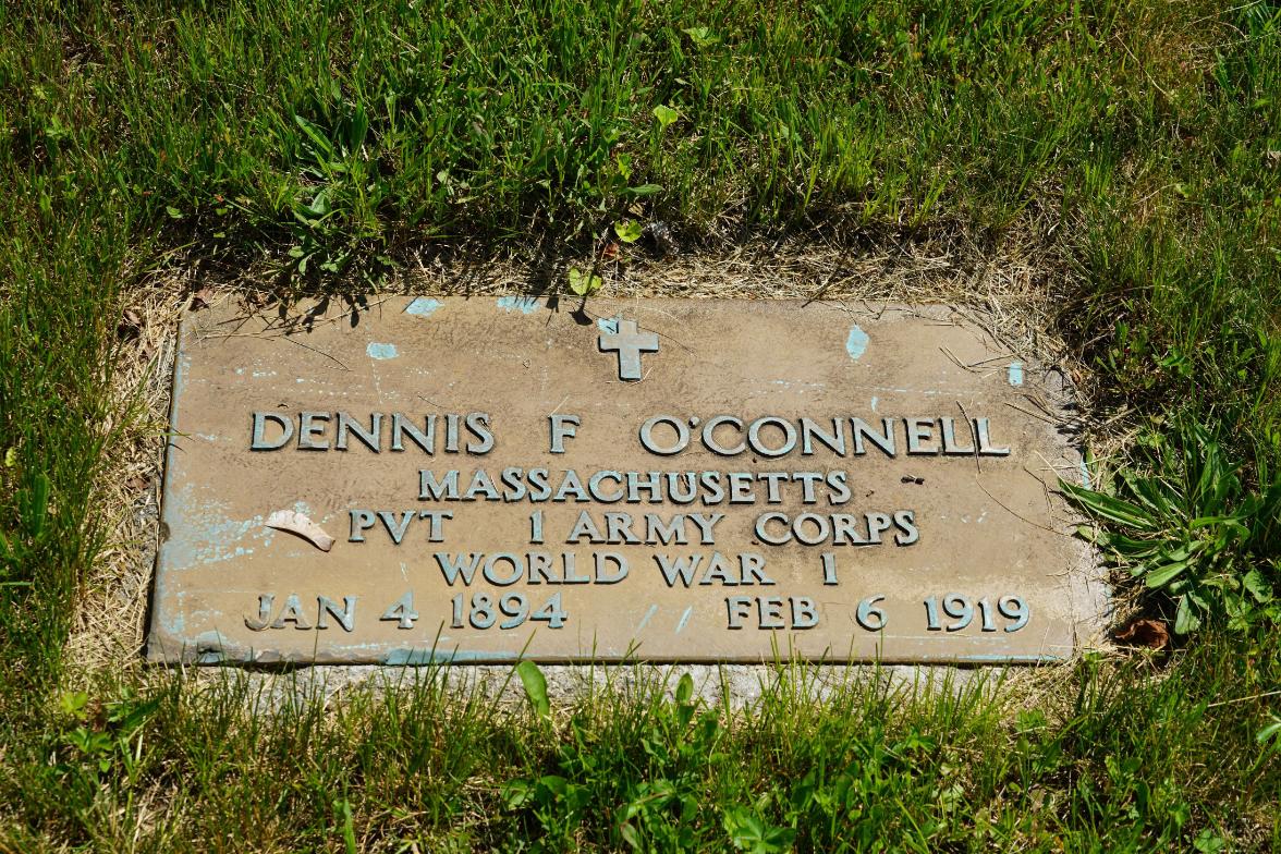 Dennis F. O'Connell was born on January 4, 1894. He served in the 1st Army Corps as a Private during World War I. He died of disease on February 6, 1919, in the hospital La Courneau, Camp Hunt in France. He was buried at Saint Bridget's Cemetery, Maynard, Middlesex County, Massachusetts, USA.