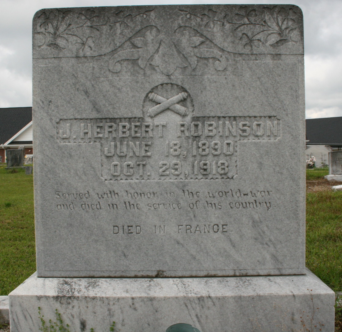 Joseph Herbert Robinson was born on June 18, 1890. He served in the US Army as a Private during World War I. He died of disease on October 29, 1918, in the hospital La Courneau, Camp Hunt in France. He was buried at Nine Forks Baptist Church Cemetery, Easley, Pickens County, South Carolina, USA.