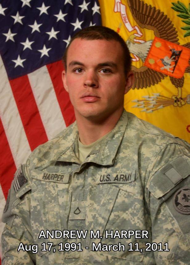 Andrew Martin “Bo” Harper was born on August 17, 1991, in South Carolina. He was the son of Steven Matthew Harper and Deanna Jeanette Anderson Harper Wells. He attended Nutter Fort Primary and Intermediate School, Washington Irving Middle School, and later transferred to South Harrison Middle School. He went on to attend University High School in Morgantown, West Virginia, graduated in 2009, and soon afterward enlisted in the United States Army. He held the rank of Private First Class and served with I Company, 3d Squadron, 2d Stryker Cavalry Regiment, stationed in Vilseck, Germany, and was later deployed to Afghanistan.