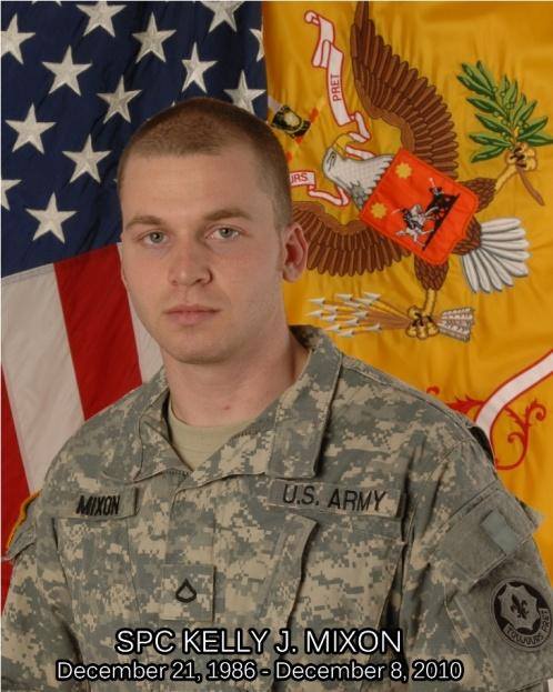 Kelly Joseph Mixon was born on December 21, 1986, in Florida. He was married to Amy Mixon. He was a graduate of Fernandina Beach High School and enlisted in the service in 2008. He held the rank of Specialist and served as an Infantryman with H Company, 3d Squadron, 2d Stryker Cavalry Regiment, stationed in Vilseck, Germany, and was later deployed to Afghanistan.