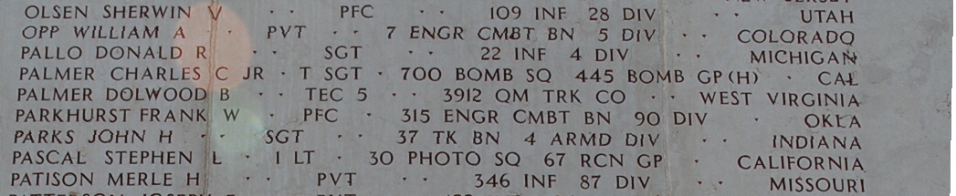 TSgt Palmer was declared Missing in Action and officially declared dead on September 28, 1945. His name is memorialized in the Tablets of the Missing in the Luxembourg American Cemetery and Memorial, Hamm, Canton de Luxembourg, Luxembourg, Luxembourg.