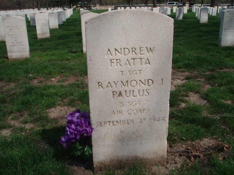 TSgt Fratta was already dead when a fellow airman went to pull him down before parachuting to safety. He is buried alongside his crewmate, SSgt Paulus, in the same grave at Rock Island National Cemetery in Rock Island, Rock Island County, Illinois, USA.