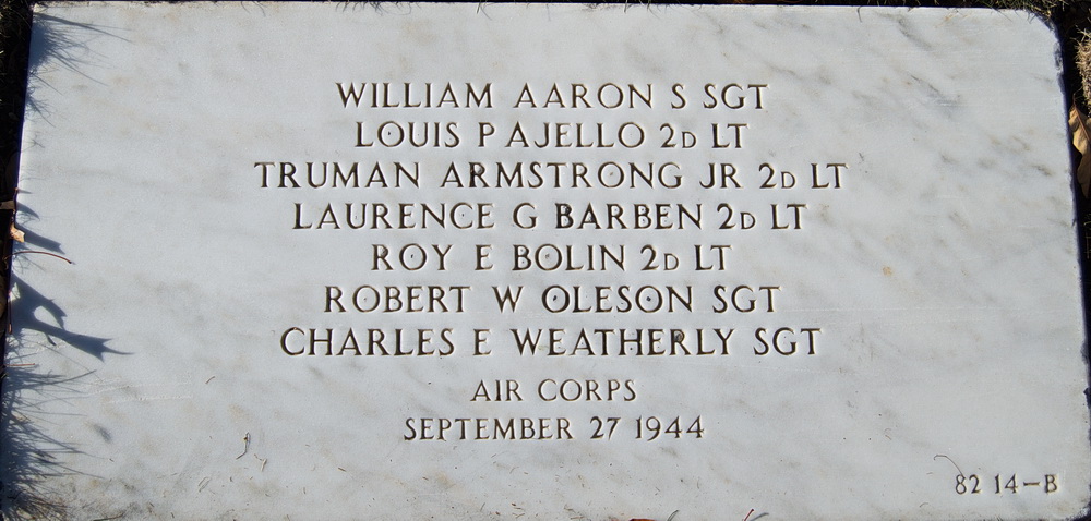 2Lt Armstrong was killed in action and is now laid to rest alongside his fellow crew members, SSgt Aaron, 2Lt Ajello, 2Lt Barben, 2Lt Bolin, Sgt Oleson, and Sgt Weatherly at Jefferson Barracks National Cemetery in Lemay Township, St. Louis County, Missouri, USA.
