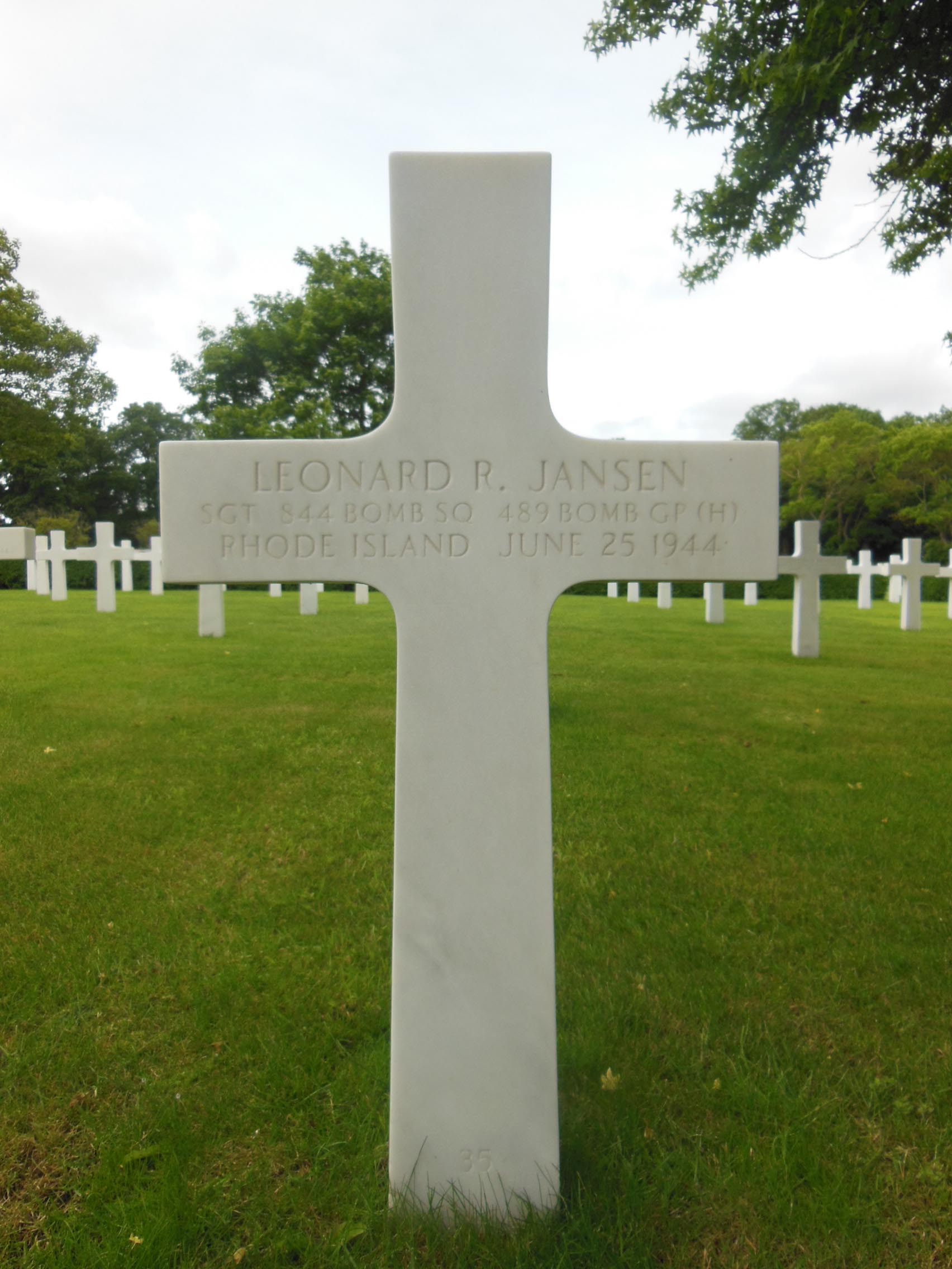 Sgt Jansen was Killed in Action and is now buried in the Cambridge American Cemetery and Memorial, Coton, South Cambridgeshire District, Cambridgeshire, England.