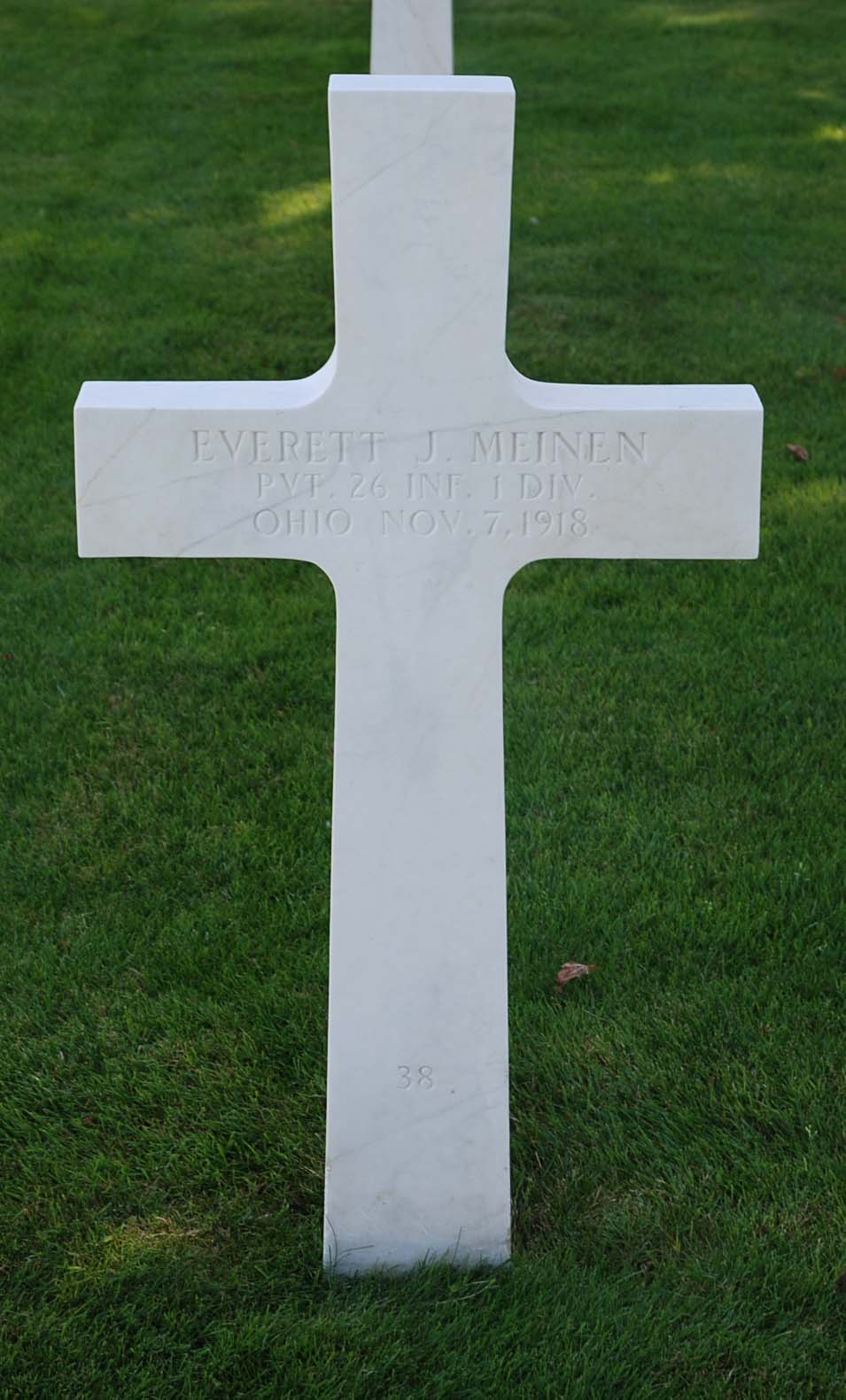 When Everett J. Meinen was born on October 23, 1893, in Ohio, his father, Hans, was 38 and his mother, Johanna, was 26. He had one brother and four sisters. He entered the military service in Ohio. He served in the U.S. Army during World War I as a Private in HQ Company, 26th Infantry Regiment, 1st Infantry Division. He died on November 07, 1918 and is now buried in Meuse-Argonne American Cemetery and Memorial, Romagne-sous-Montfaucon, Departement de la Meuse, Lorraine, France.