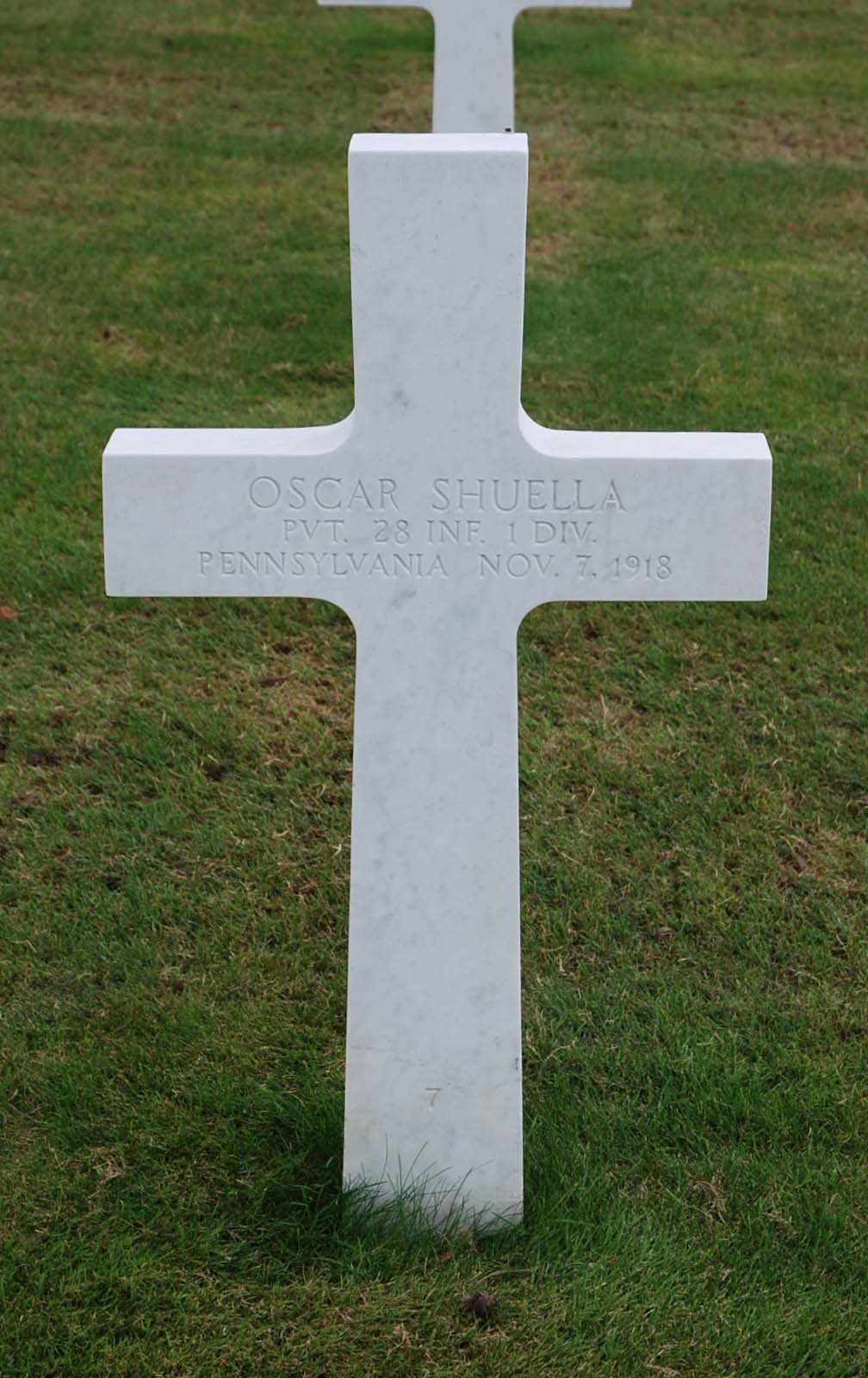 Oscar Shuella entered the military service in Pennsylvania. He served in the U.S. Army during World War I as a Private in I Company, 28th Infantry Regiment, 1st Infantry Division. He died on November 07, 1918 and is now buried in Meuse-Argonne American Cemetery and Memorial, Romagne-sous-Montfaucon, Departement de la Meuse, Lorraine, France.