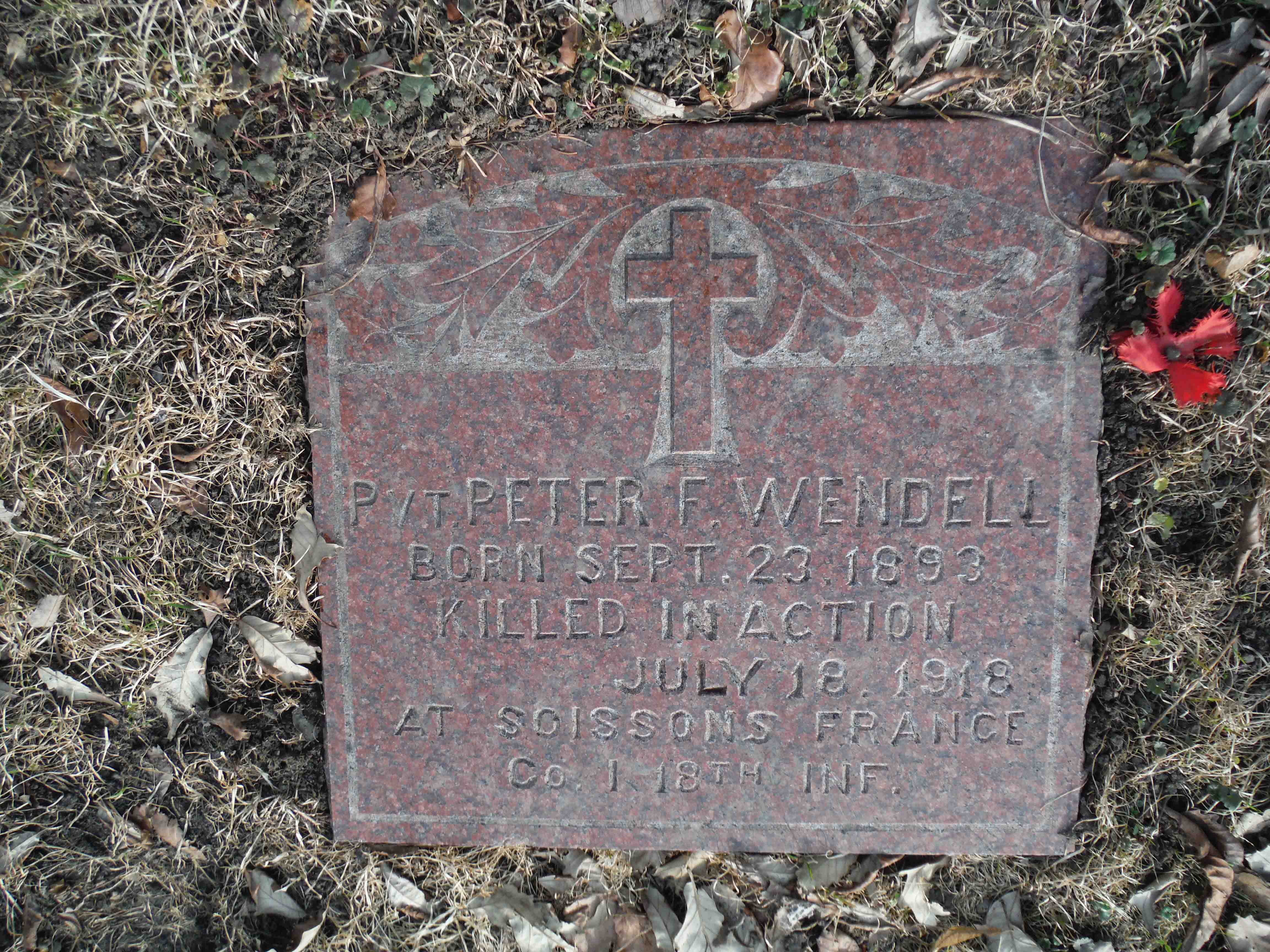 Peter F. Wendell was born on September 23, 1893 in Chicago, Cook County, Illinois. His father is Ernest F. and his mother is Sophia Schuster. He served in the U.S. Army during World War I as a Private in Company I, 18th Infantry Regiment, 1st Infantry Division. He was Killed in Action on July 18, 1918, at the age of 24 and maybe buried in Saint Joseph Cemetery, River Grove, Cook County, Illinois, USA. Note: The burial maybe a cenotaph, his remains maybe buried elsewhere. Confirmation needed.