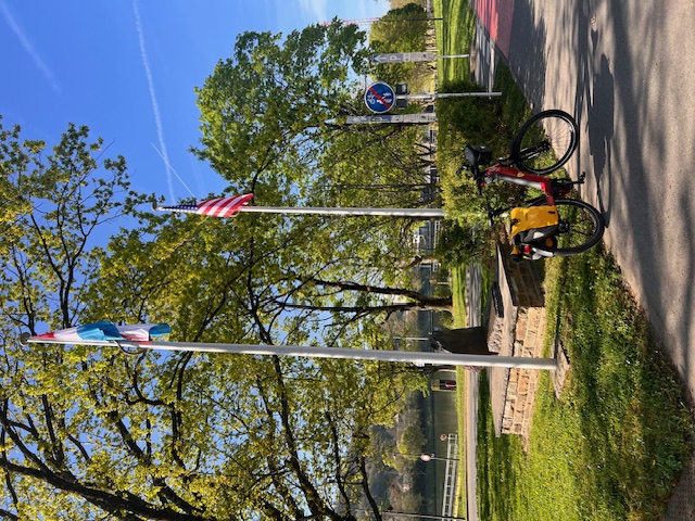 Monument and plaque flanked by two flag poles remembering the 83rd Infantry Division during WW2.