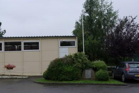 In the town hall parking lot, amidst bushes, sporting a plaque commemorating an American aviator.